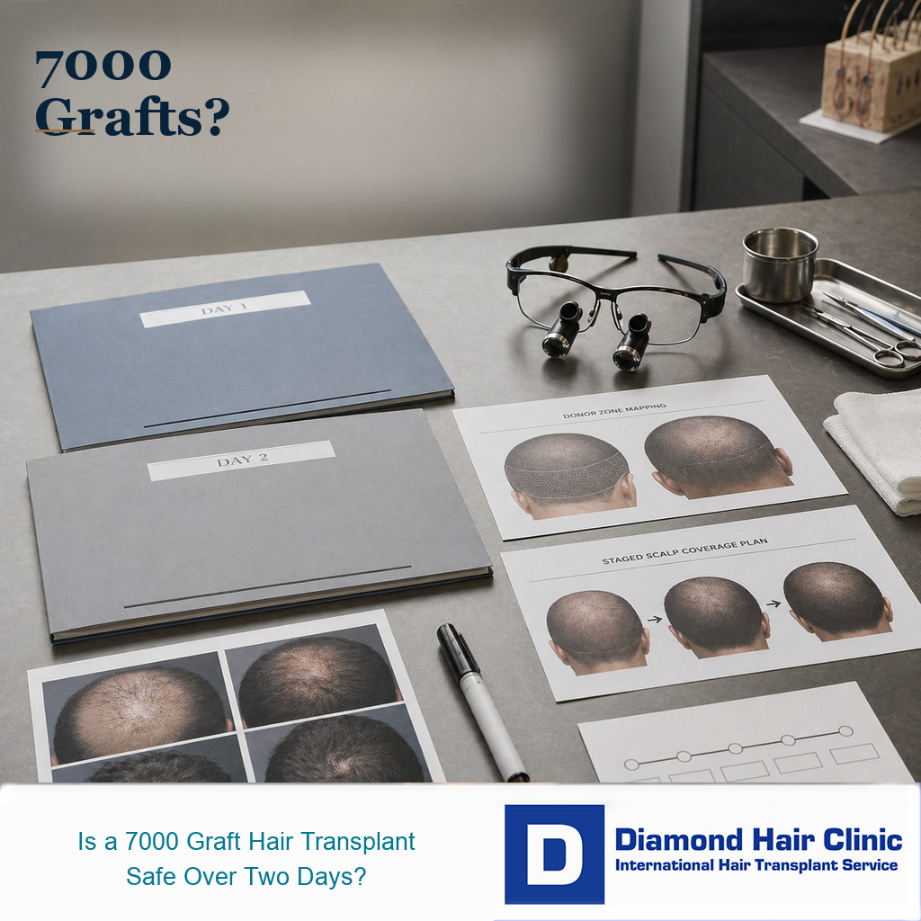 A 7000 graft hair transplant over 2 days can be physically possible in selected patients, but I do not treat it as a routine safe plan. The safer answer for many patients is staged surgery, especially when the donor area, crown, and future hair loss are not fully understood.
